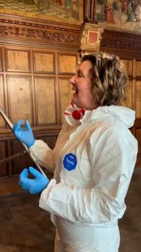 The Music Room of Knockderry Castle is a spectacular room. When designed and constructed by William Leiper for the 1896 renovation of Knockerry, no expense was spared. From the inlaid tiled fireplace, bronze rimmed windows, parquet floor, wood paneling, minstrels gallery to the art which spans surrounds the entire room and ceiling, the room was exquisitely elegant.Walk into the Music Room now, close your eyes, and you can almost picture the concerts, balls, and parties that graced the room. Keep them closed and you can picture wounded French soldiers from World War II convalescing as they admired the best that Scotland had to offer them. The Music Room is what sold Chelom and I on Knockderry when we first stepped foot in the Music Room in the Fall of 2022. Three months later it was also the room that nearly made us turn our backs on the project and walk away. January 2, 2023 was decision day for us and what we saw sickened us.Water was streaming down south wall of the room, completely soaking the not only the art but also the amazing burl wood paneling. Portions of the art was already badly damaged, but not as bad as it being damaged on that January day. Chelom and I could knew intuitively that unless we purchased it immediately and went to work finding and stopping the leaks, the room would not be recoverable.Deciding to move ahead with the purchase, our crew of talented craftsmen identified and stopped the majority of the leaks. But making the Music Room water tight took another several months to accomplish. We're certainly hopeful that we've stopped the leaks for good.On to the restoration of the art!Recently, Karen Dundas and her colleague Shannon spent a week removing the damaged art from the wall to restore it properly and cleaning the thick mold that had been growing on much of the rest of the art for half a year.Karen and her team are taking the restoration of the art in several phases over the course of several months. But their recent visit was significant because they were able to remove the mold and remove the art that has been so badly damaged. On the first day of their recent visit, Karen was kind enough to allow us to video her explanation of what they were seeking to accomplish during the week. She has consented to the video being placed on the blog. Thank you, Karen and Shannon!