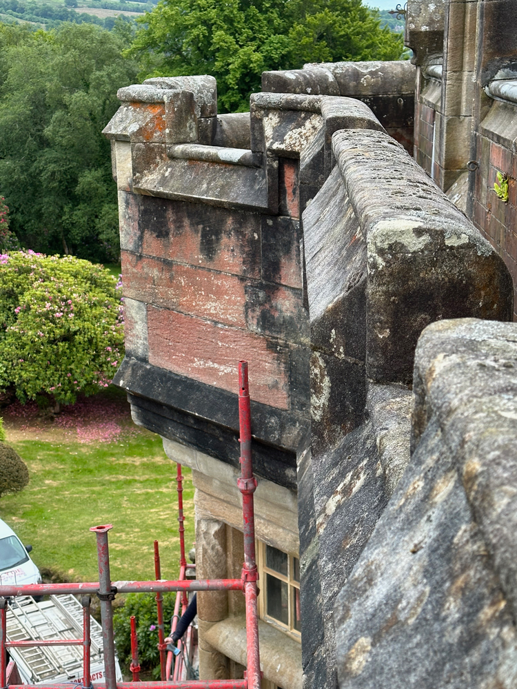 Whether to scrub the exterior of the castle is a bit of a debate, it seems, among historical building folk. Some favor the older patina that the structure has earned through the centuries, while others view restoration as bringing the castle back to what it would have looked like when it was newer. Chelom and I fall in the camp of those who believe that a good scrubbing is a must every century or two. And so, as part of this process we'll gradually wash the castle off, in hopes of restoring its original look. We'll undertake the task of washing the castle a bit at a time in conjunction with when we have scaffolding set up on various parts of the castle. That will allow us to get to the higher elevations. An important consideration is how to give the castle a good wash. Many modern chemicals will eat away the old stone, so you've got to be careful what you use as a solution to get the layers of history off the building. Another problem is that if you wash the castle with a high pressure washer, you'll eat away the stone. So the trick is to use low pressure with the mildest of detergents.